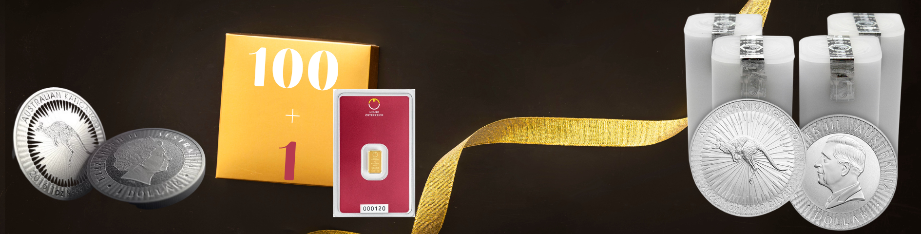 W zestawie: 4 x zapieczętowana tuba Kangaroo + 1g sztabka złota w prezencie (Münze Österreich, Argor-Heraeus, Valcambi, Germania)