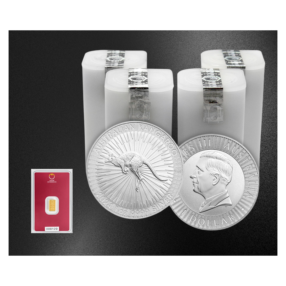 W zestawie: 4 x zapieczętowana tuba Kangaroo + 1g sztabka złota w prezencie (Münze Österreich, Argor-Heraeus, Valcambi, Germania)