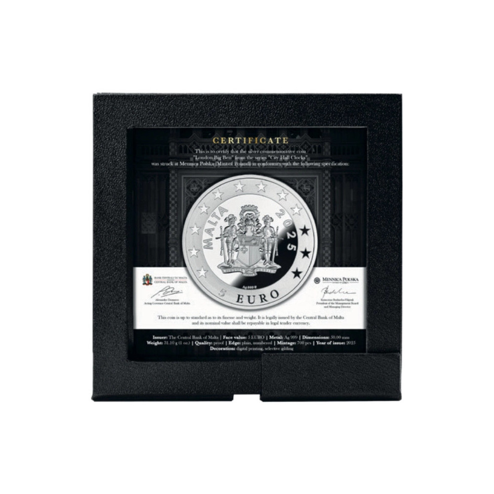Ta ekskluzywna srebrna moneta o wadze 1 uncji jest drugą monetą z serii "City Hall Clocks" i wybija rytm londyńskiego Big Bena. Big Ben. Wzniosły. Niezachwiany. Przecinający mgliste powietrze nad Tamizą. Co kwadrans rozbrzmiewa "Westminster Quarters". Oczy uniesione, gdy kroki odbijają się echem od bruku. Wdychamy chłodne powietrze. Serca urzeczone falą dźwiękową. Wciąż rozciągnięta ręka. Nieustępliwy ocalały z furii II wojny światowej. Dowód wytrzymałości odlany z doskonałością Proof. Moneta jest zapieczętowana w etui z certyfikatem autentyczności. Tylko 700 sztuk na świecie.