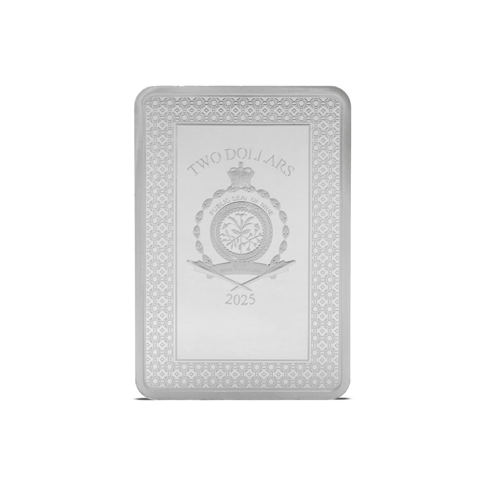 Odwrotna strona monety zawiera publiczną pieczęć kraju emitującego Niue, informacje o nominale "TWO DOLLARS" i roku emisji "2025"