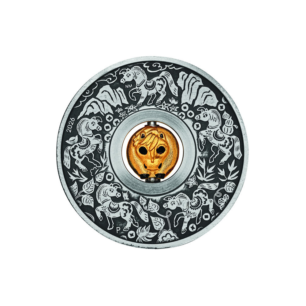 Rewers monety przedstawia obracający się pozłacany srebrny koralik w kształcie konia. Otacza go pięć koni w różnych pozycjach, przedstawionych w stylu chińskiej wycinanki, osadzonych w stylizowanych liściach. Na monecie znajduje się również znak mennicy Perth Mint "P" i rok emisji 2026.