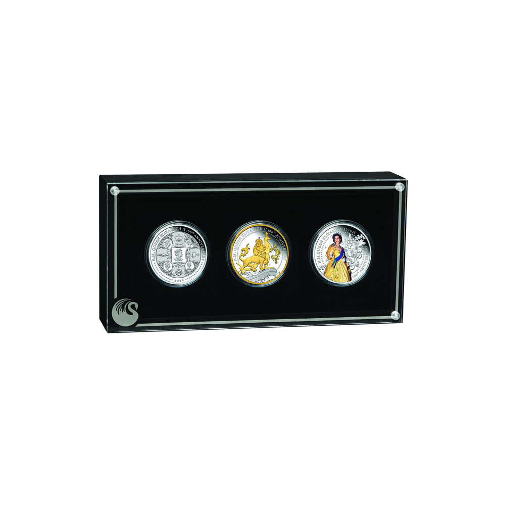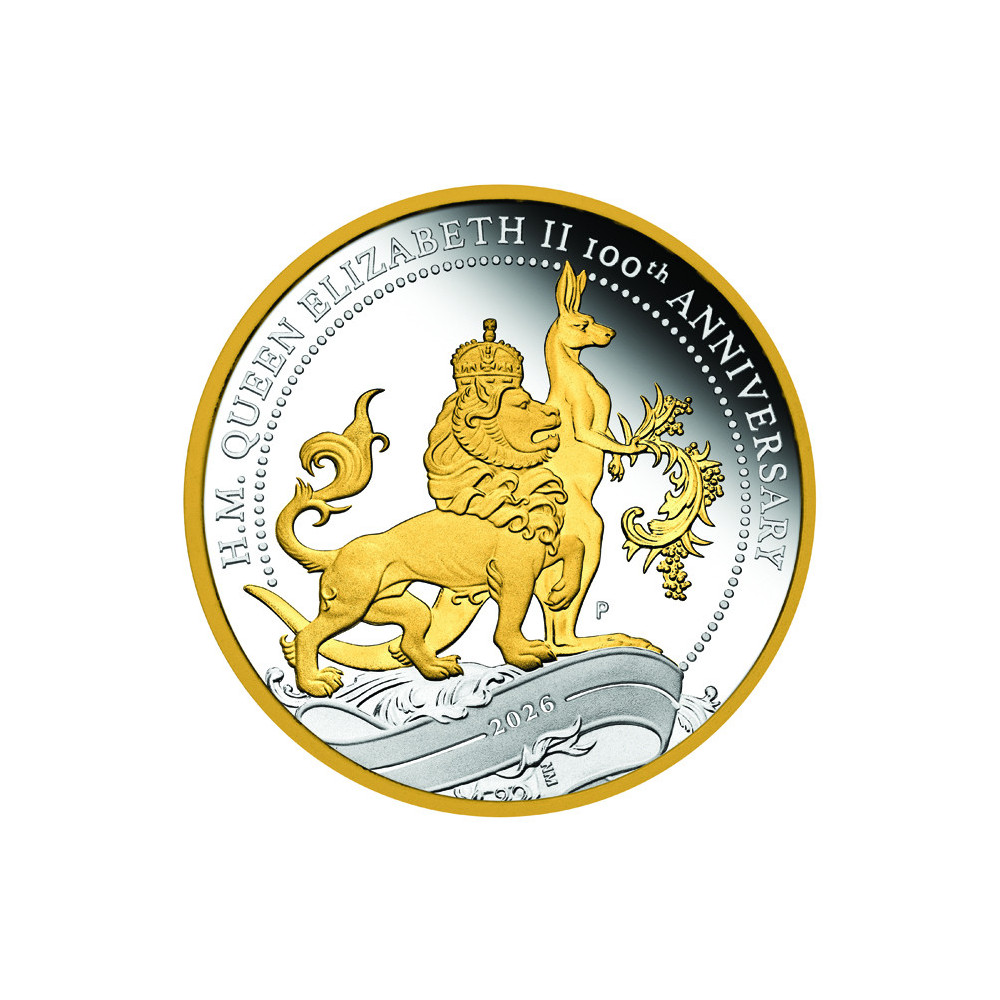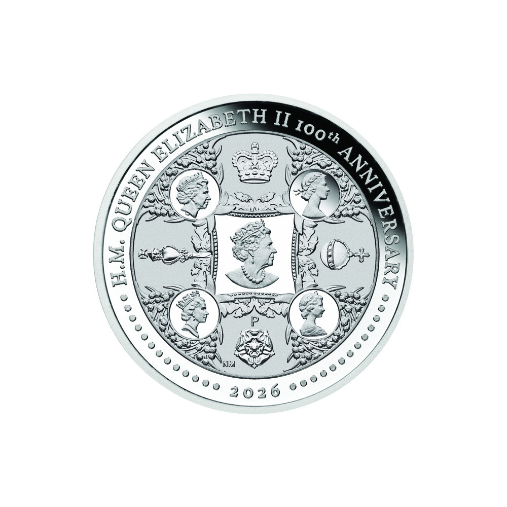 - Srebrną monetę (łączny nakład 7000 sztuk) przedstawiającą pięć wizerunków królowej Elżbiety II reprezentujących różne okresy jej panowania, otoczonych złotą wikliną i królewskimi regaliami.