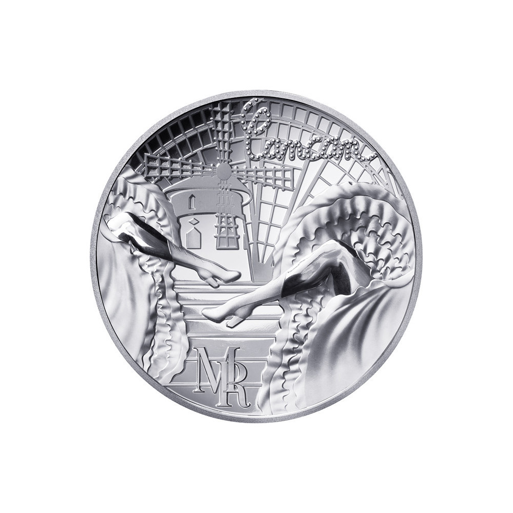 Awers monety przedstawia dwóch francuskich tancerzy kankana na pierwszym planie, uchwyconych w dynamicznym ruchu. W tle znajduje się legendarny Moulin Rouge z charakterystycznymi skrzydłami i tłem francuskiego obrazu kankana przedstawiającego część wieży Eiffla. Projekt uzupełniają inicjały Moulin Rouge.