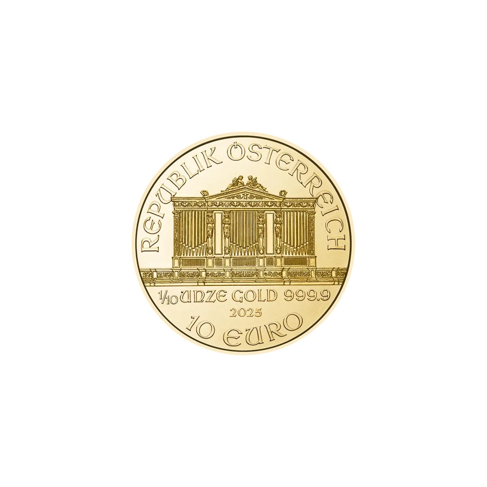 Filharmonicy Wiedeńscy zawdzięczają swoją nazwę słynnej austriackiej orkiestrze, która jest jedną z najlepszych na świecie. Awers złotej monety przedstawia wielkie organy wiedeńskiego Musikverein. Waga 1/10 uncji, próba 999,9, rok wybicia i nominał 10 euro są wytłoczone poniżej organów. Powyżej widnieje napis "REPUPLIK ÖSTERREICH". Na rewersie przedstawiono niektóre instrumenty muzyczne orkiestry filharmonicznej, a na górnej krawędzi widnieje nazwa orkiestry i złota moneta "WIENER PHILHAMRONIKER". Podobnie jak powyższe złote monety, Wiedeńscy Filharmonicy są dostępni w rozmiarach 1 uncji, 1/2 uncji, 1/4 uncji i 1/25 uncji.