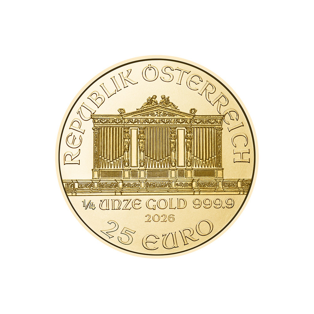 Filharmonicy Wiedeńscy zawdzięczają swoją nazwę słynnej austriackiej orkiestrze, która jest jedną z najlepszych na świecie. Awers złotej monety przedstawia wielkie organy wiedeńskiego Musikverein. Poniżej organów wytłoczono wagę 1/4 uncji, próbę 999,9, rok wybicia i nominał 25 euro. Powyżej widnieje napis "REPUPLIK ÖSTERREICH". Na rewersie przedstawiono kilka instrumentów muzycznych orkiestry filharmonicznej, a na górnej krawędzi widnieje nazwa orkiestry i złota moneta "WIENER PHILHAMRONIKER". Podobnie jak powyższe złote monety, Wiedeńscy Filharmonicy są dostępni w rozmiarach 1 uncji, 1/2 uncji, 1/10 uncji i 1/25 uncji.